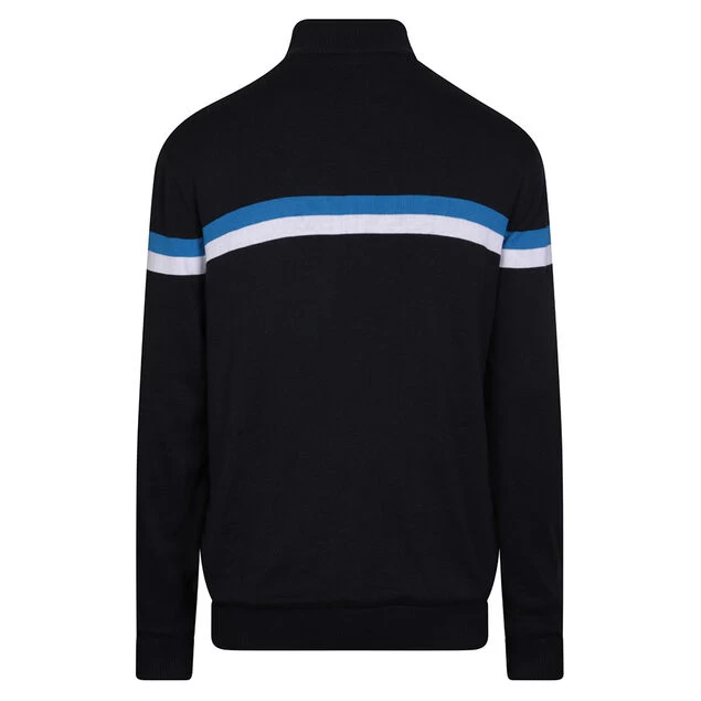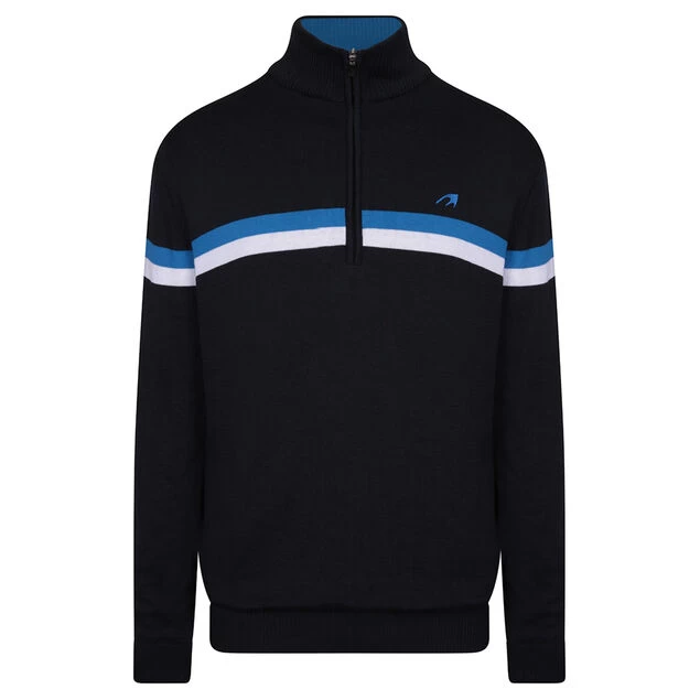 This fully lined knitted sweater has a design that ensures comfort and style playing golf. It has a natural stretch and is made with soft and warm fabric, backed with a stretch lining to shield you from the elements. The garment has a half-zip opening for adjustability, raised collar, ribbed details on the collar cuffs and hem. Plus highlighted with a contrasting stripe and a Benross logo on the left chest for authenticity.