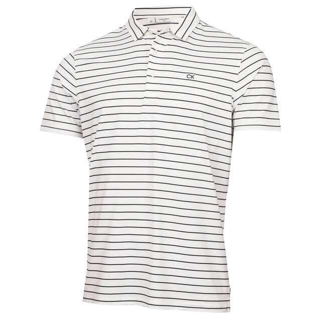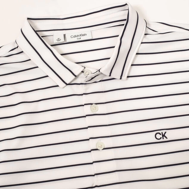The key to any great round of golf is having the confidence to perform, so tee it up with this high-performance polo shirt with added stretch fabric. This Calvin Klein shirt is equipped with a lightweight and breathable fabric, that offers moisture-wicking comfort, keeping you cool and dry under pressure with minimum effort. Designed with a classic button placket and self-fabric collar, all-over stripes, and a CK logo embroidered on left chest for added distinction