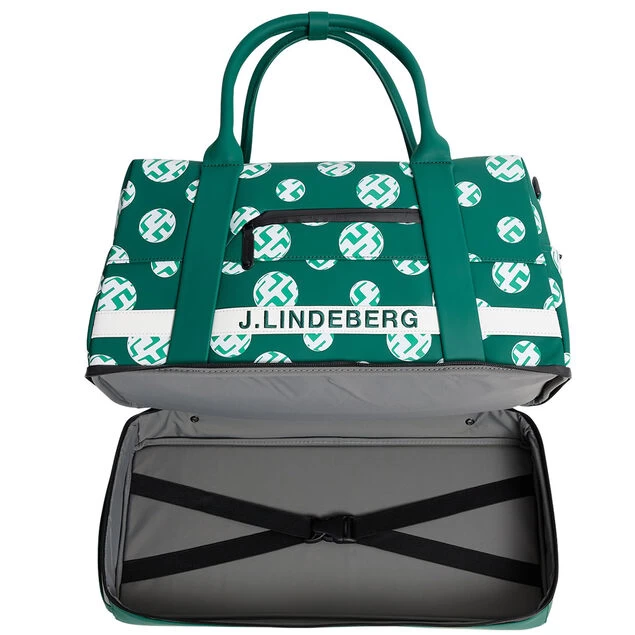 This premium luggage bag has been constructed with durable synthetic leather material, offering around 49 litres of storage. It has top carry handles and an additional shoulder strap, and an embroidered logo and bridge monograms to ensure it stands out. The bag has a large main compartment with water-resistant zip, and 6 pocket spaces that include 2 vent compartments and a lower compartment where you can store golf shoes. Highlighted with a seasonal print and J.Lindeberg embroidered branding.